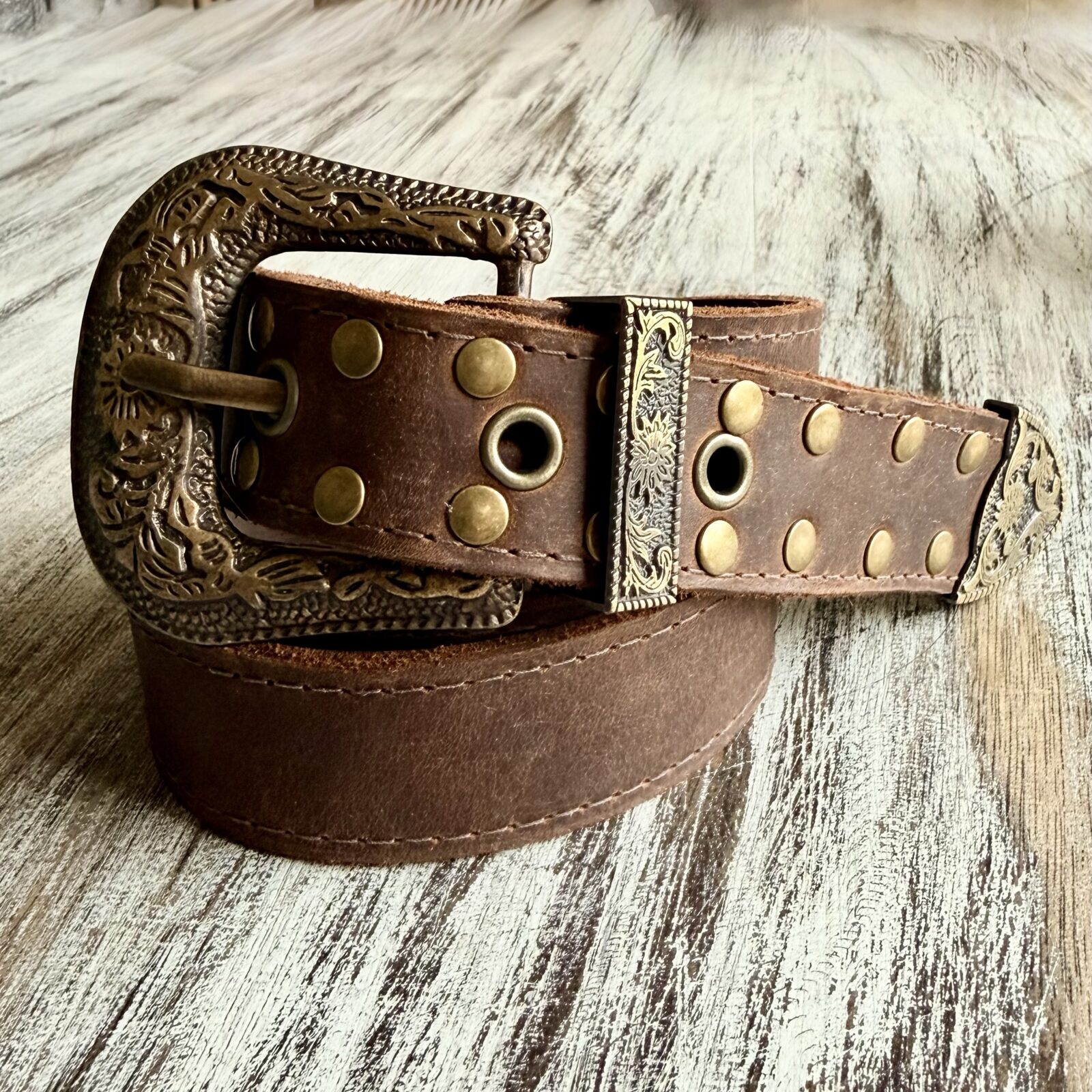 Cinturón doble cuero De Flor con Hebilla Grande y Puntera En tono envejecido y Remaches Las medidas son de Hebilla a punta